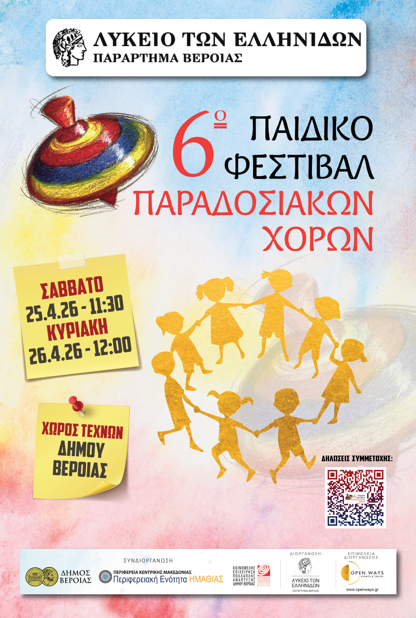 Το 6ο Παιδικό Φεστιβάλ Παραδοσιακών Χορών θα πραγματοποιηθεί στις 25 Απριλίου στις 11:30 π.μ. & 26 Απριλίου στις 12:00 μ.μ. στο χώρο Τεχνών Δήμου Βέροιας.